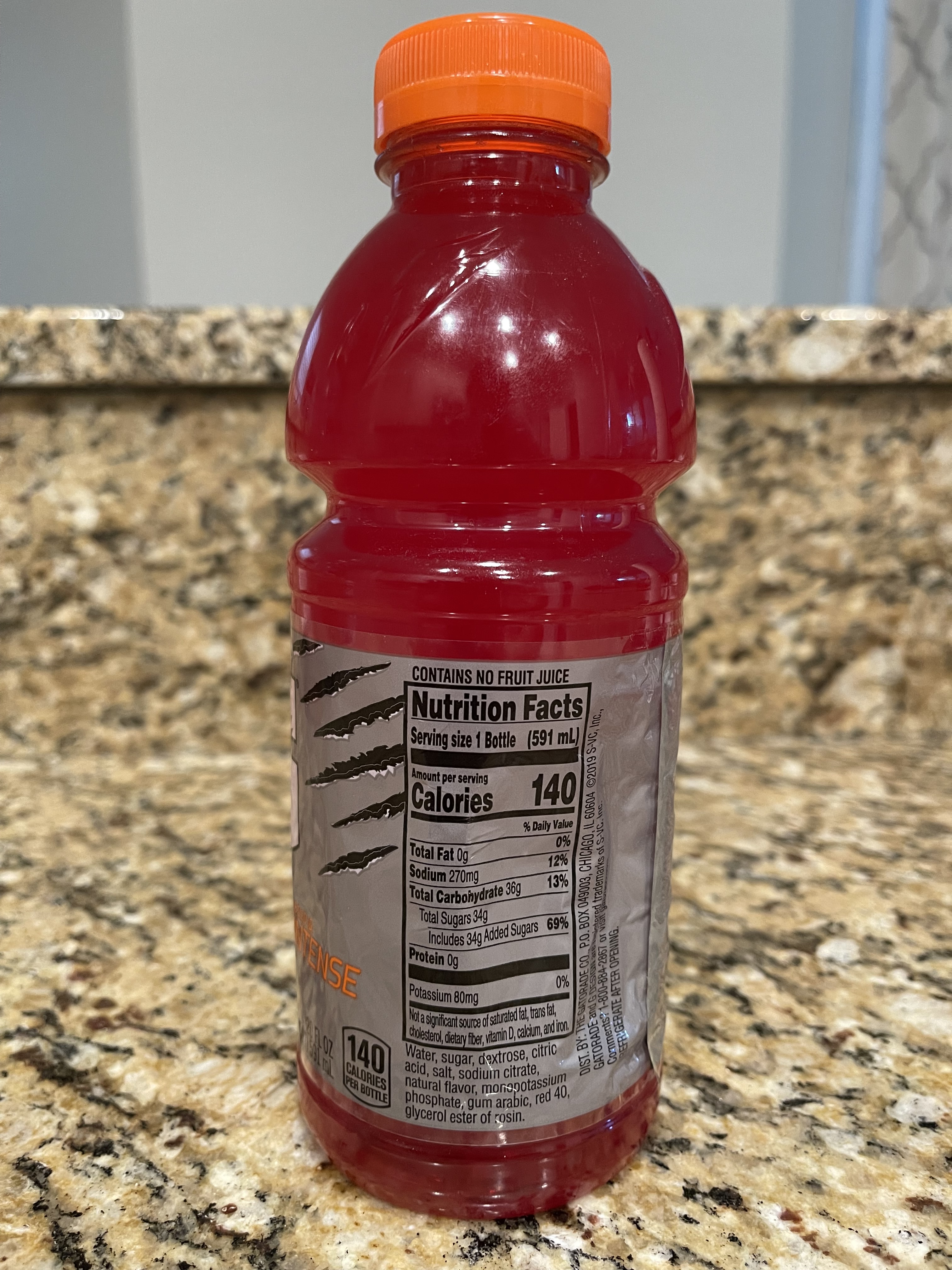 Do you drink Gatorade or any exercise enhancement drink? Have you looked at the amount of sugars these drinks have? A 20oz bottle of Gatorade contains 34 grams of added sugars that is 69% of your daily value.